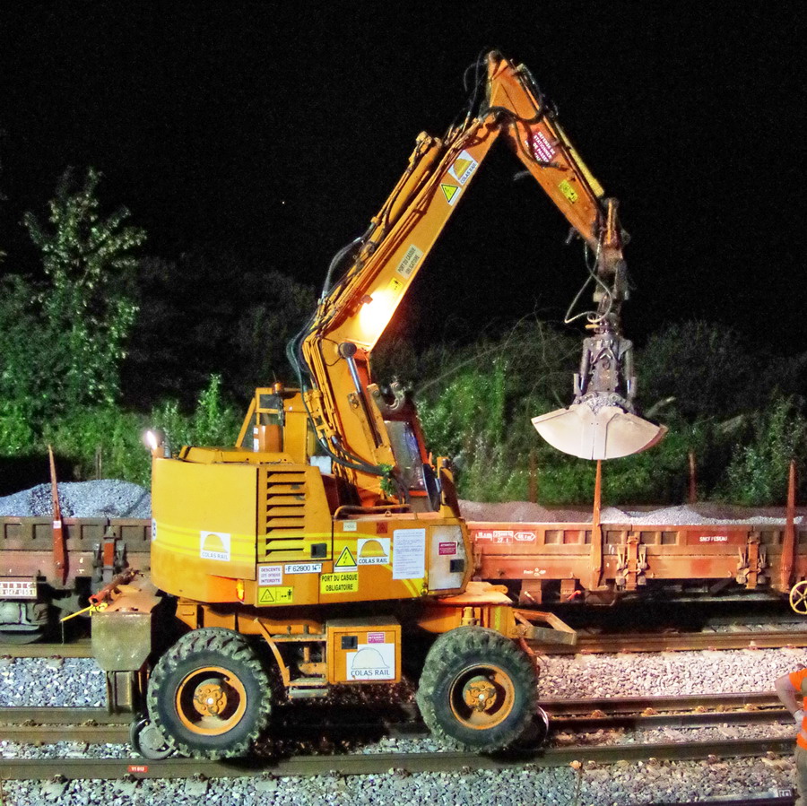 avec la présence des deux Pelles Rail route Colas Rail pour les travaux de caniveau