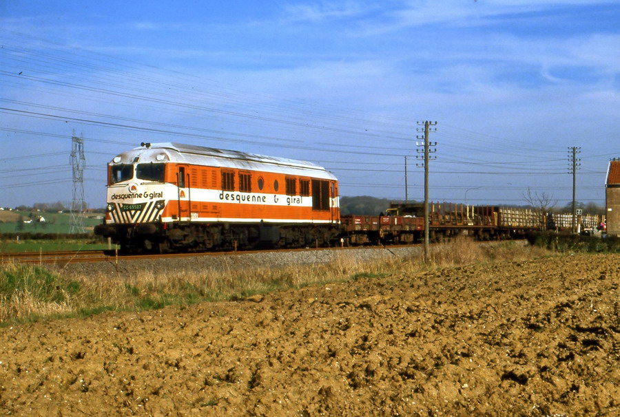 Voila la CC 65507 en livrée Desquenne & Giral vers 1989/1990 sur une rame de travaux entre Hazebrouck et Calais