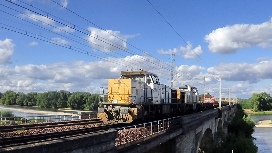Tête du Train de pose MC avec La Coupe pont de la Loire à Montlouis-sur-Loire le 11-09-2018
