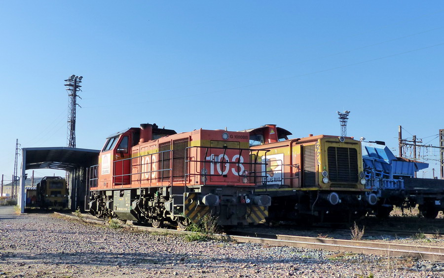 Je suis tombé sur un nid de Vossloh de Colas Rail malheureusement sous une pluie battante, avec 2 G 1206 n°102 et 104
