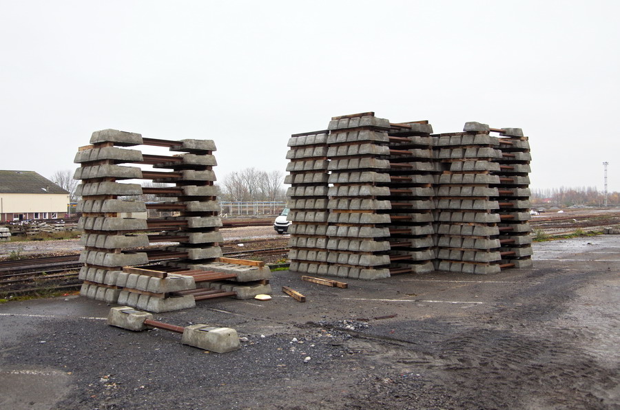 les traverses bibloc neuves pour le chantier Colas Rail sur le site de travaux de Longueau le 26-11-2018