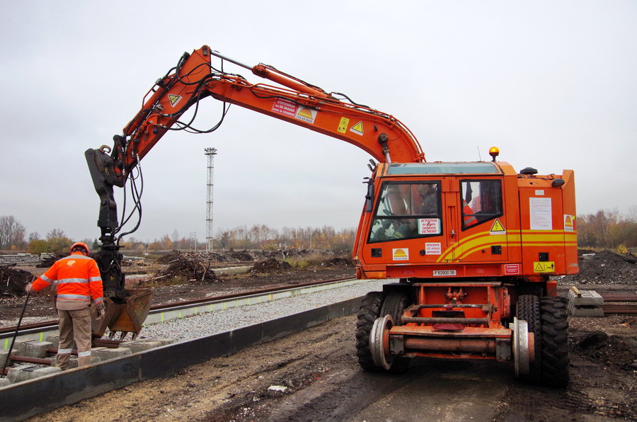 mise en place des traverses bibloc neuves avec la Pelle Rail route Case 788 PRR n° CGG0229077 Colas Rail F 6200036 sur le site de travaux de Longueau le 26-11-2018