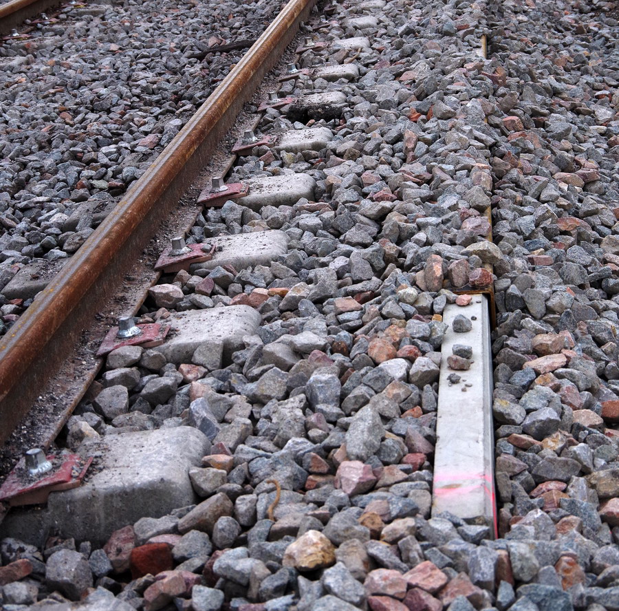 couche de ballast de 5 cm pour le relevage du rail sur l'Estacade sur la base de travaux de Longueau