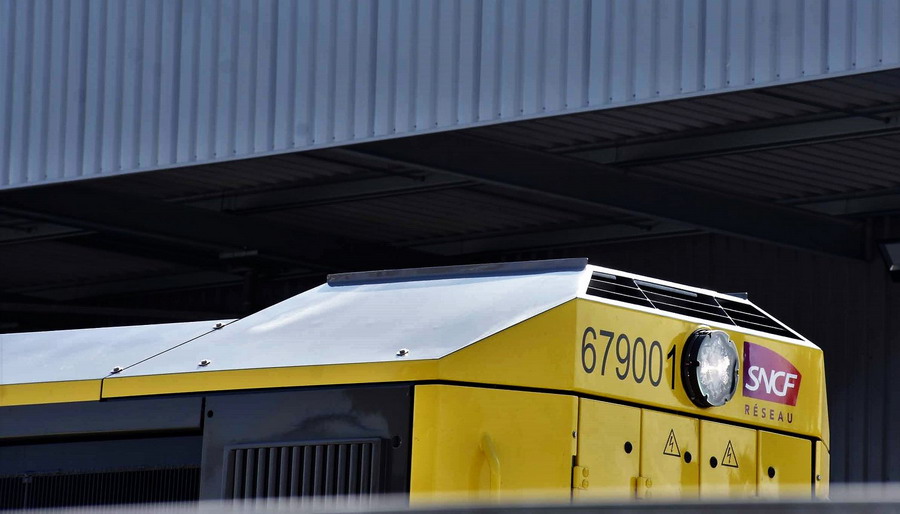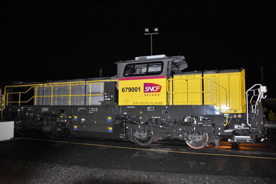Nous pouvons voir le double marquage sur la cabine avec l'EVN n°92 87 0079 001-9 F-AKIEM et 679001 pour SNCF RESEAU