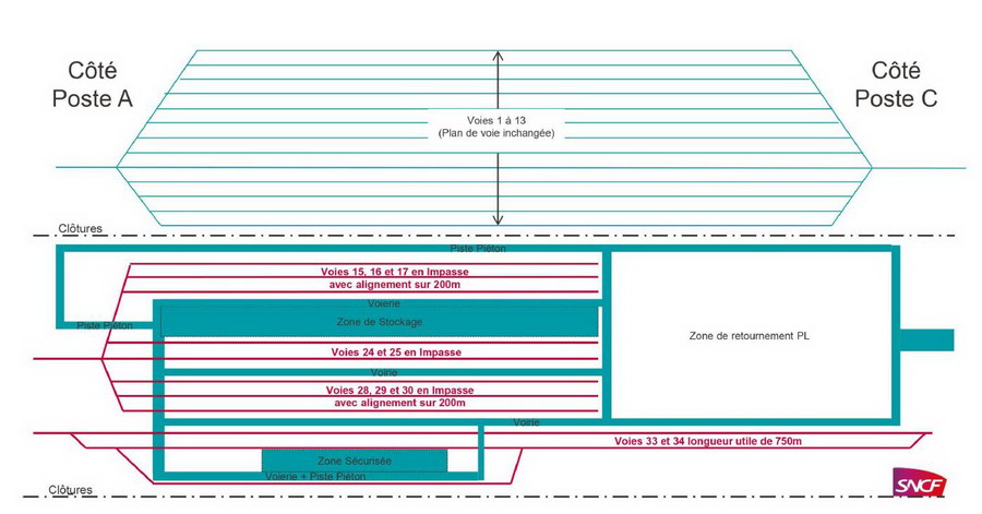 La future base-travaux sera située sur le faisceau dit "formation" avec les voies 14 à 37, le long de la ligne 292 000 reliant