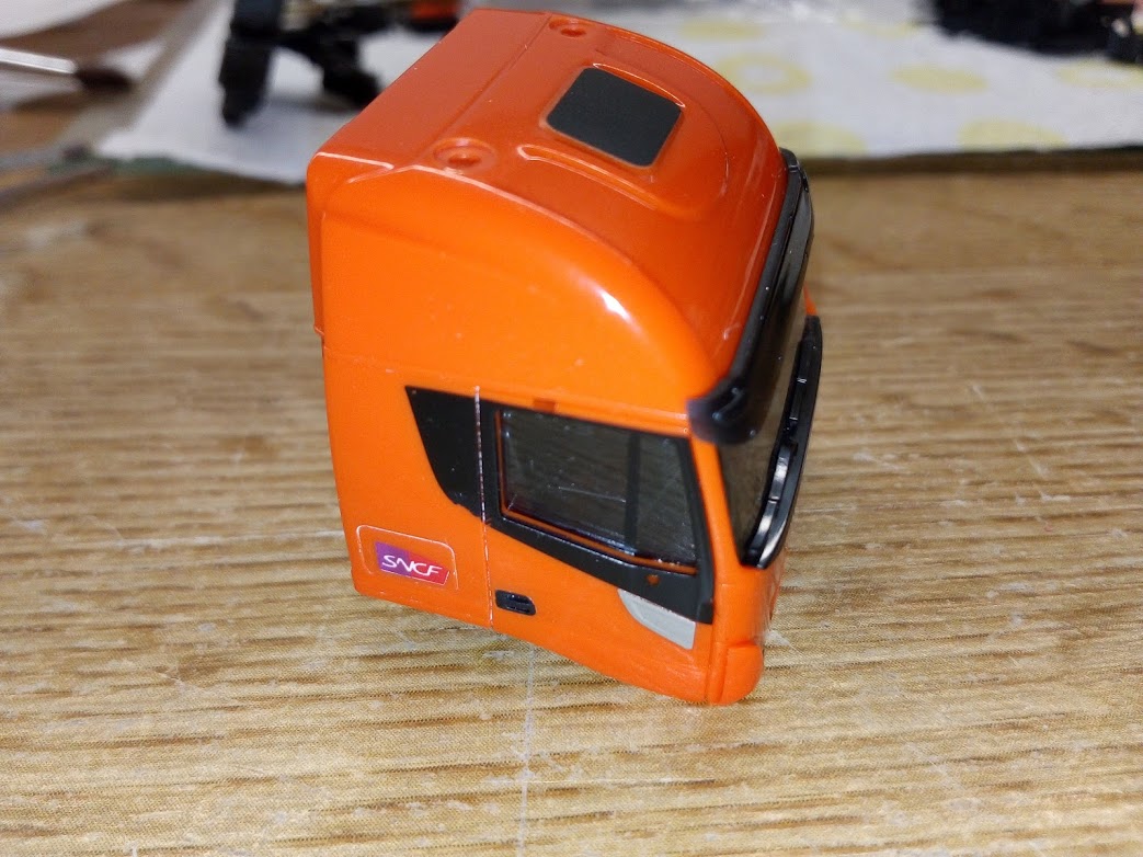 après avoir effacé les anciens marquages avec du décapant et coton tige, place à la pose des logos SNCF et des rétroviseurs