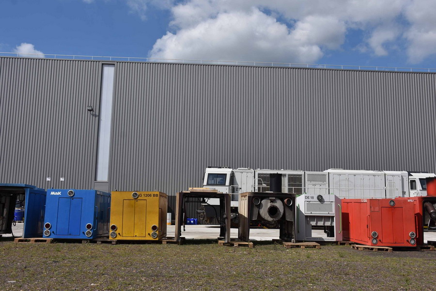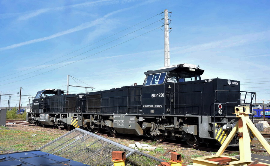 ensemble de capots moteurs de G 1206 en livrée bleue, jaune, blanc et rouge sur le site d'IMATEQ à SPDC le 29-04-2019