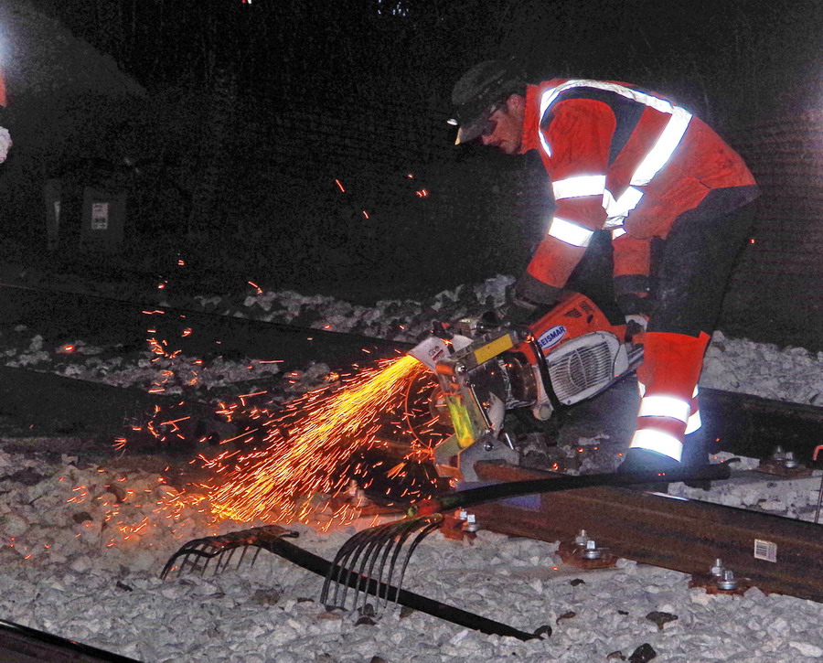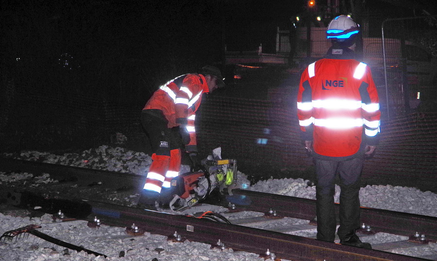séance de découpe avec une tronçonneuse du rail au PN 58 à Chauny nuit du 25 au 26-04-2019