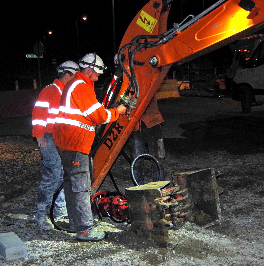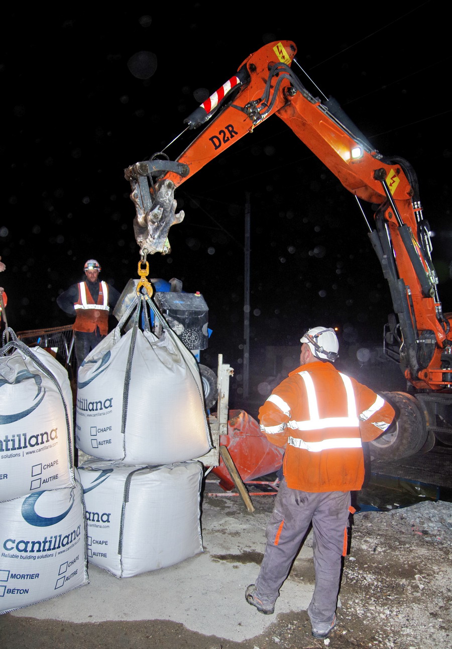 déchargement des sac du béton prêt à l'emploi de Cantillana pour les trous de mâtage au PN 58 à Chauny nuit