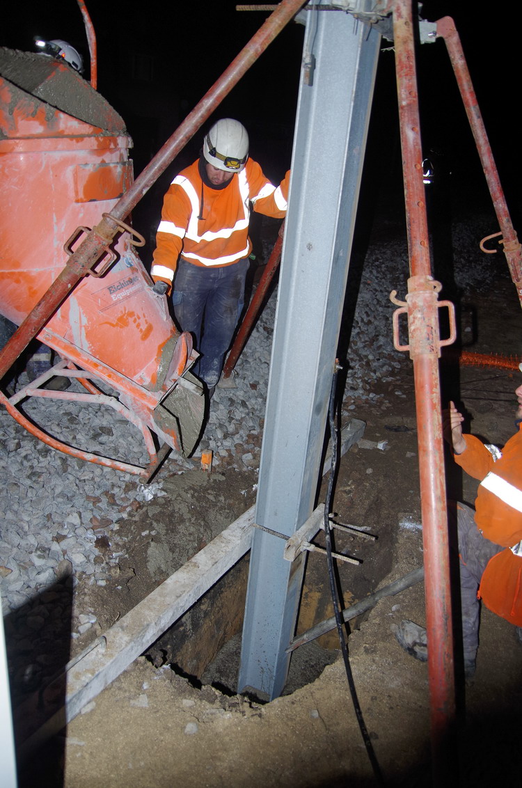 fixation du poteau de caténaire dans un trou de mâtage pour le coulage du béton prêt à l'emploi au PN 58 à Chauny nuit