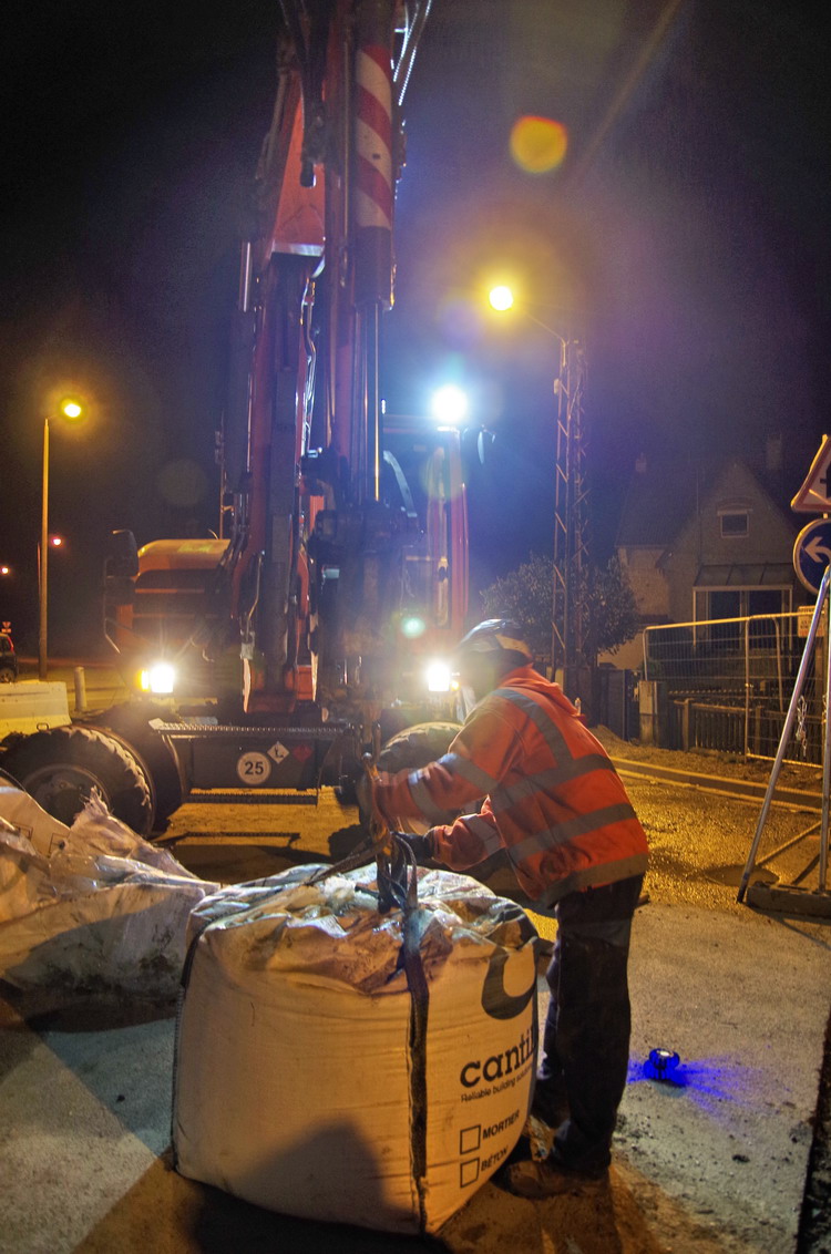 déchargement des sac du béton prêt à l'emploi de Cantillana pour les trous de mâtage au PN 58 à Chauny nuit