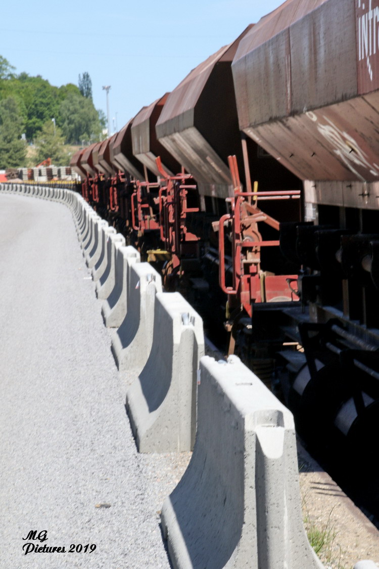- une rame de wagons plates RES d'ERMEWA sur la nouvelle base arrière de l'ex triage du Puy-Imbert le 14-05-2019