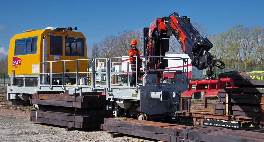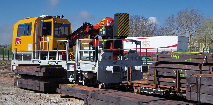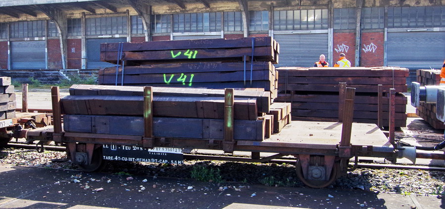 pour le transfert des traverses en bois neuves sur les deux remorques de la Draisine