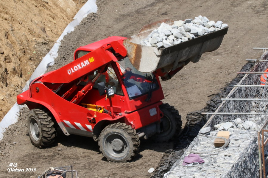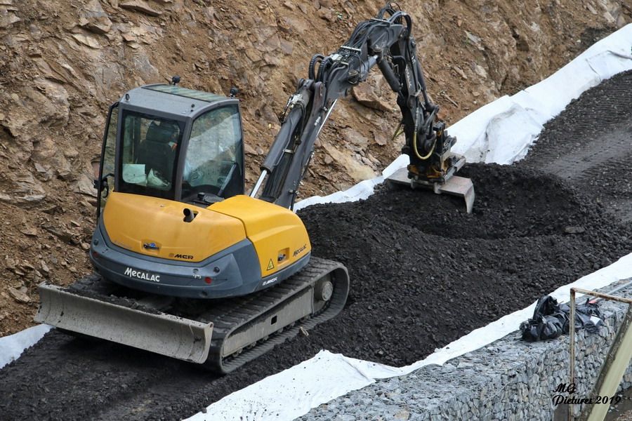 suite des travaux avec une Pelle Mecalac le long du coteau pour une nouvelle voie d'accès le 12-06-2019
