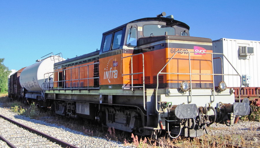 Voici la 6 64610 Infra ex 63698 mise en service le 23-04-1954 en livrée Arzens avec le logo Infra