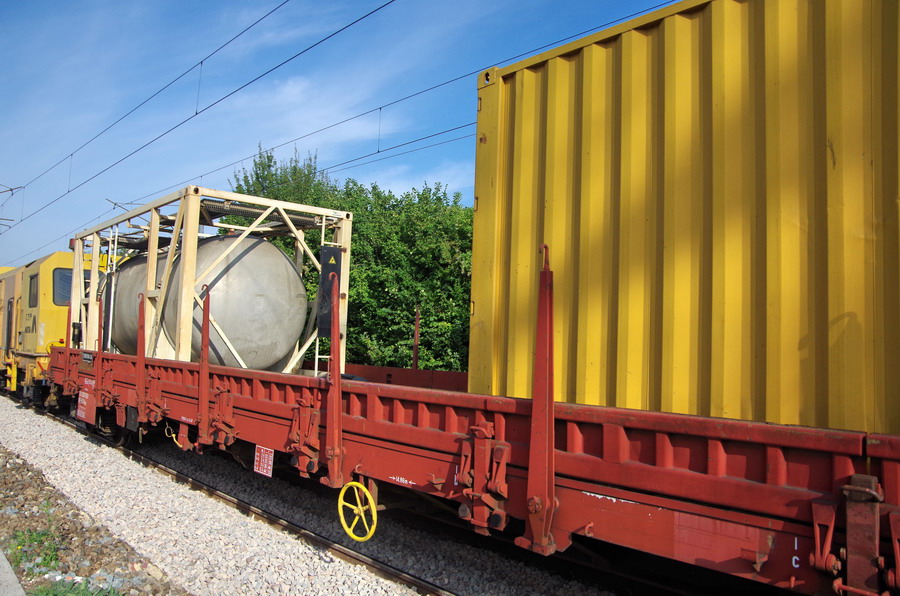 - Wagon plat 33 87 3936 162-8 Res RIV F-ERSA avec citerne et container jaune