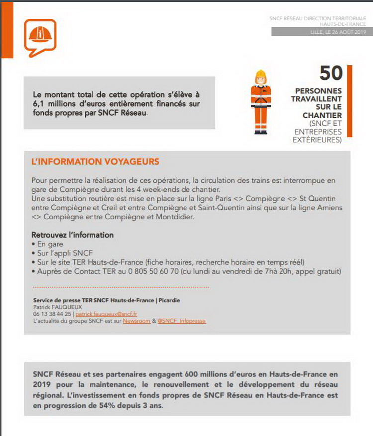 Informations de la SNCF, travaux de modernisation de la voie ferrée au niveau de la gare de Compiègne du lundi 12 août au