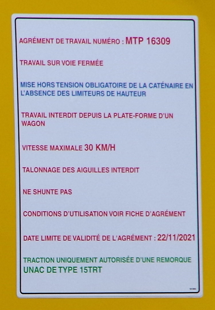 - Pilote 1 n° UNC0022FACP500103 Agrément de travail MTP 17 183 pour Colas Rail (Hors Service)