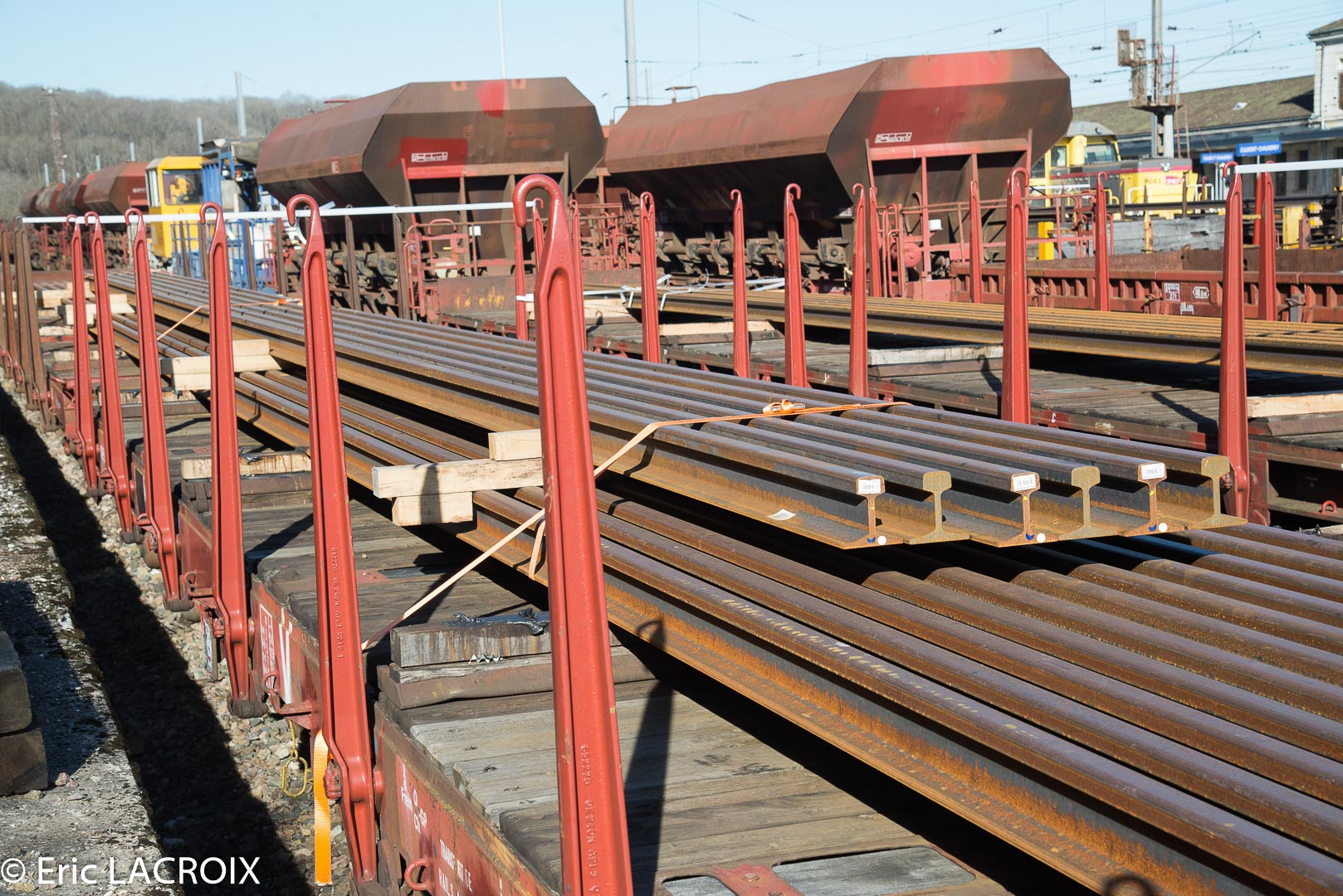 Wagon transport de rails courts R27 Uas SNCF R à Chalindrey en février 2019.