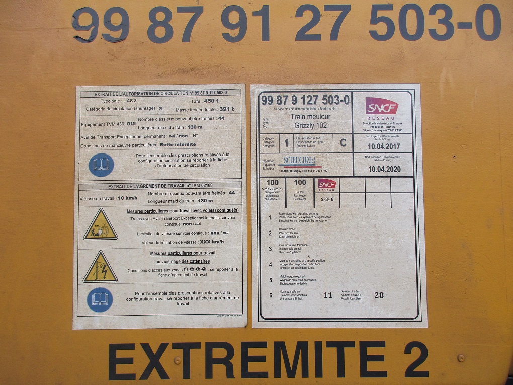 Sur le chantier actuel, elle enlève par meulage la couche décarburée du rail neuf. La suppression de cette couche de protection dure (sortie d'usine) élimine les défauts de fabrication ainsi que les microfissures provoquées par écrasement aux passages des circulations tout en améliorant les caractéristiques générales de résistance du rail. En évoluant, ces cassures provoquent des infiltrations d'eau qui entraînent à leur tour l'apparition de corrosion et de rouille. Les instruments d'analyses et de mesures sont disposés dans les éléments d'extrémité. Ici l'extrémité 1 :