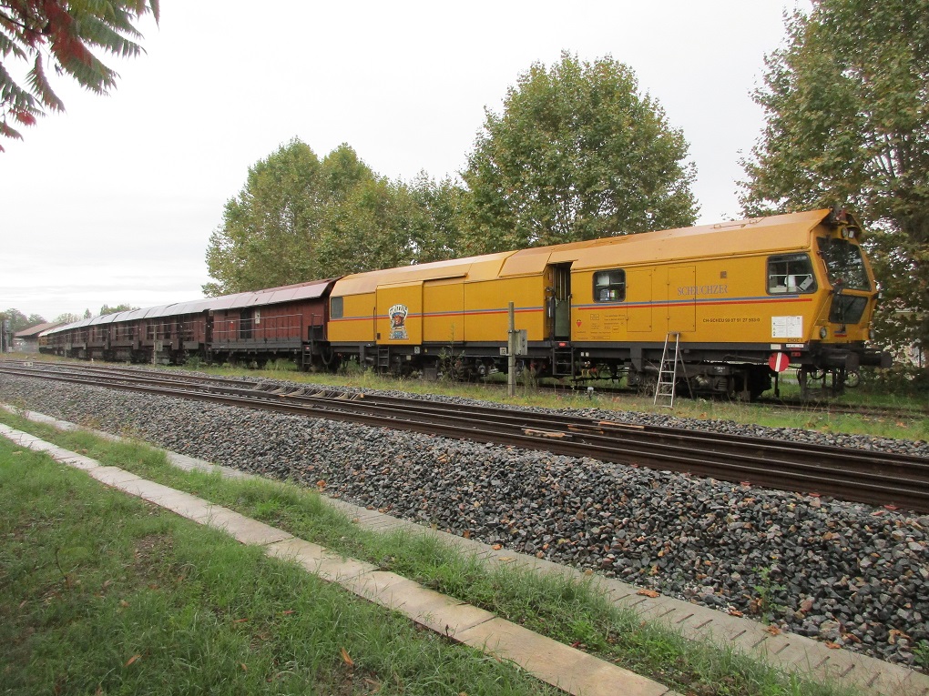 Hasard et coup de chance au cours d'un bref séjour dans la région. Mardi 22 Octobre 2019 un train meuleur de rails stationne sur une voie en impasse en gare de Sainte Foy la Grande. C'est la rame GRIZZLY 102 de la société Suisse SCHEUCHZER :