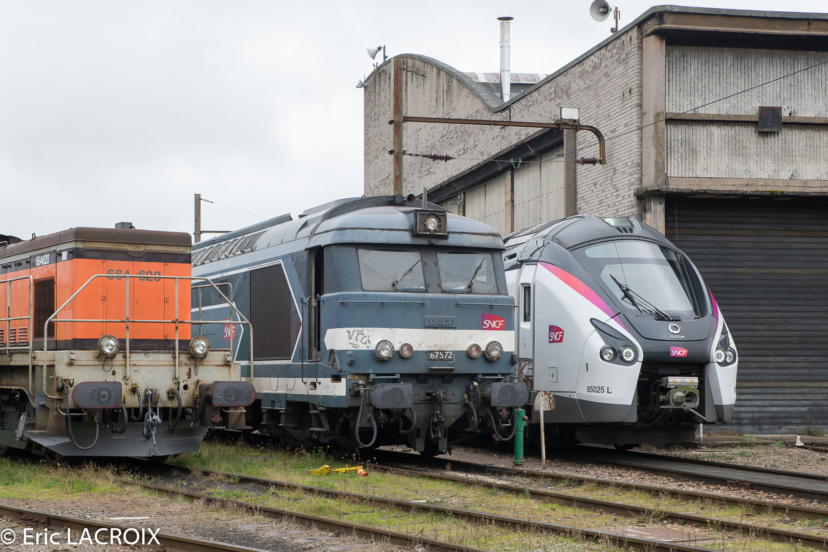 J'ai surpris cette 567572 encore très présentable sur une rame de wagons porte-rails stationnée dans le faisceau de Bitray, ancien triage de la gare de Châteauroux (Indre), le 9 novembre 2016 :