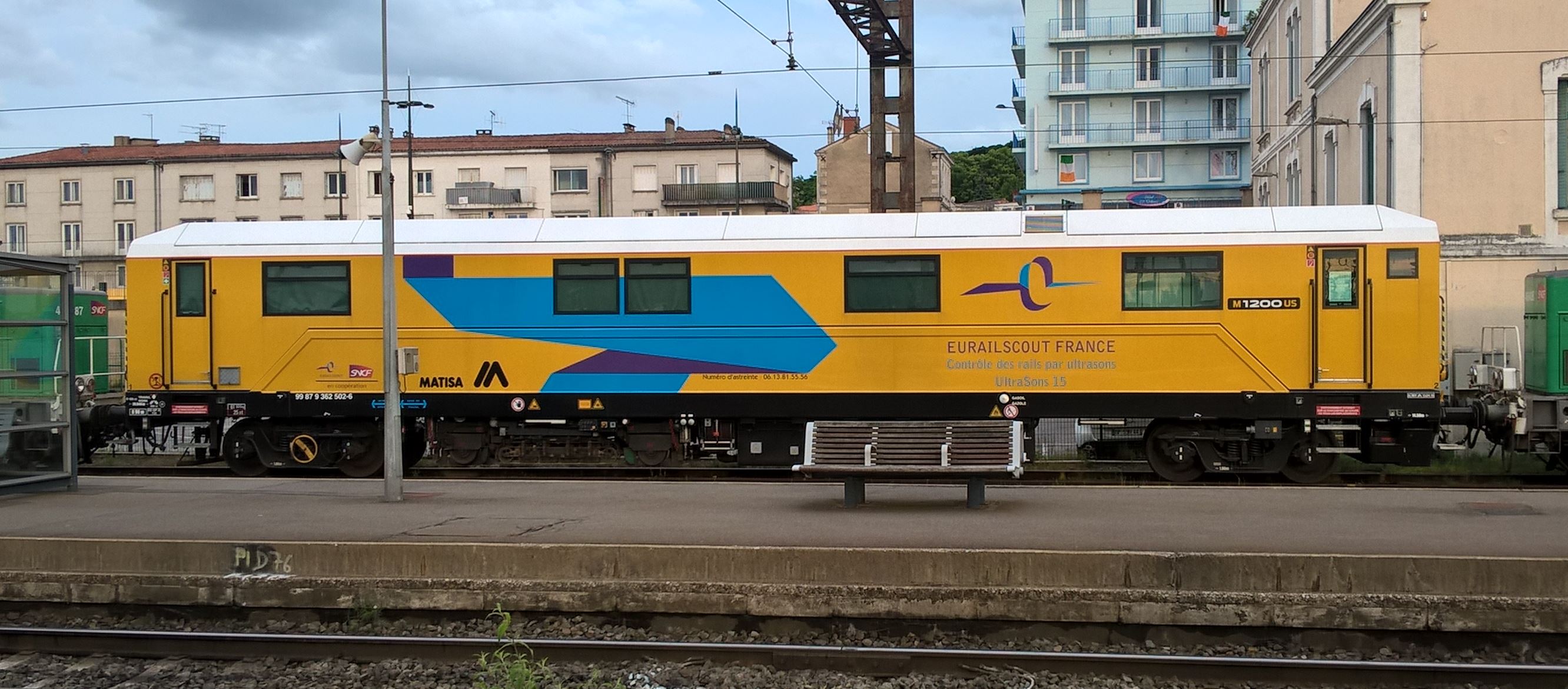 Voici une voiture de contrôle ultrason des rails toute neuve. elle est construite par Matisa (modèle M1200US). Ce serait la voiture V15 selon le marquage. Elle est exploitée en joint-venture entre la SNCF et Eurailscout suite au rapprochement des deux sociétés. Vue à angoulême le 15 juin 2016.