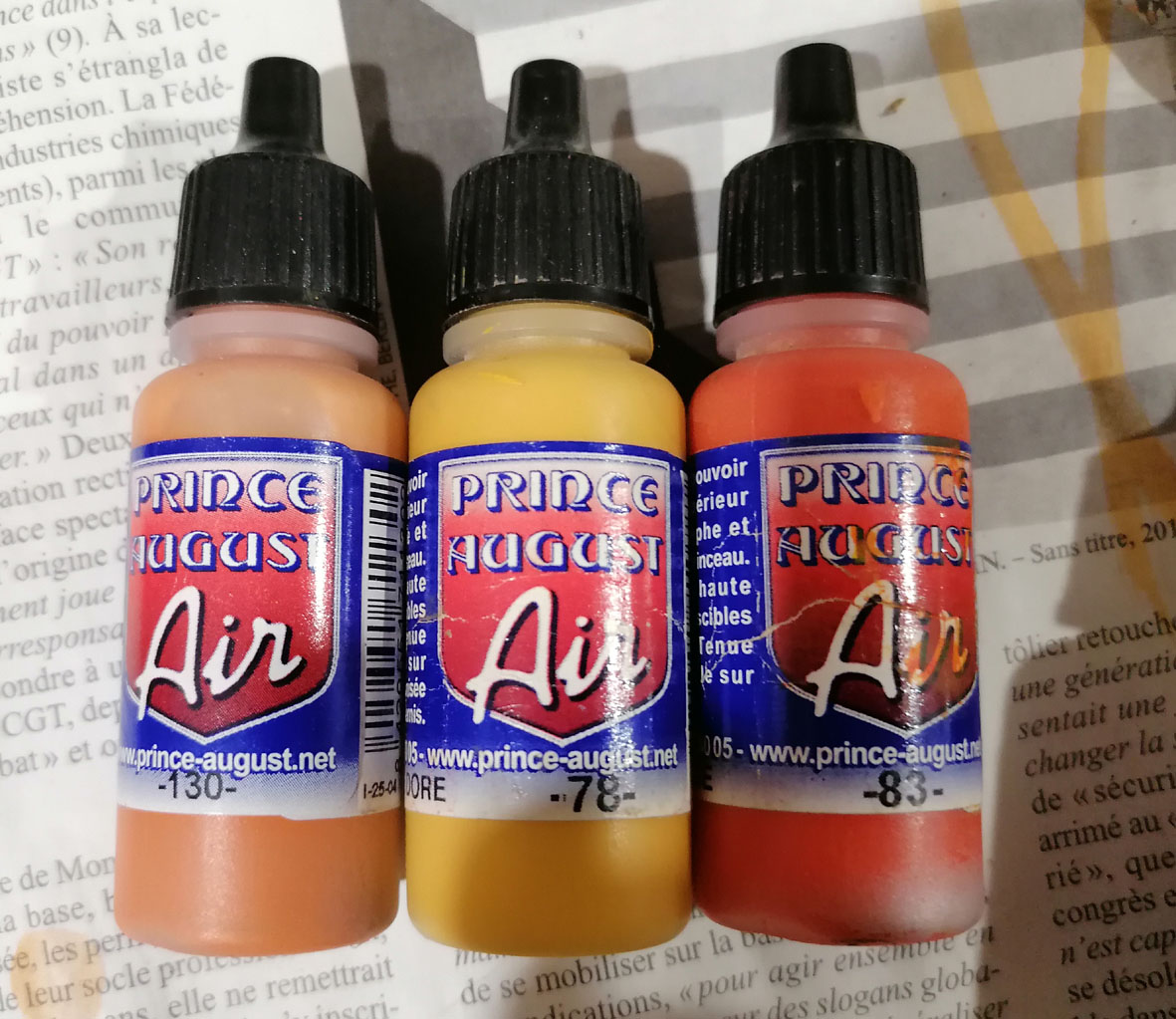 Pour toutes mes patines j'utilise la gamme Pince August et des bombes pour faire le blanc et le jaune. Pour l'orange une base orange + jaune avec du gris ou du cyan pour désaturer la couleur. Je fais les mélange à l'oeil.