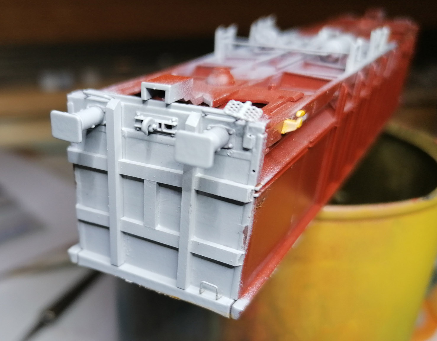 Maintenant j'attaque l'extérieur du wagon E74 avec une couche d'aprêt en bombe Tamiya.
