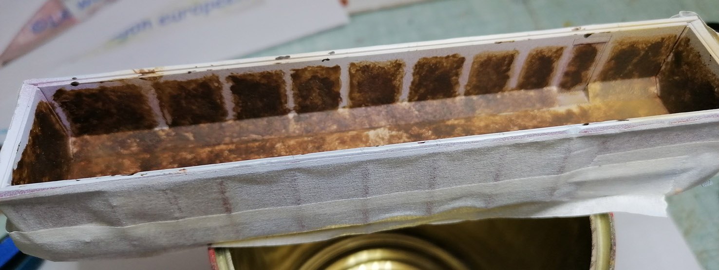 J'ai commencé par "encrasser" les parois de colle blanche, de rust texture et de pigments. J'ai gardé les renforts lisses pour le moment.