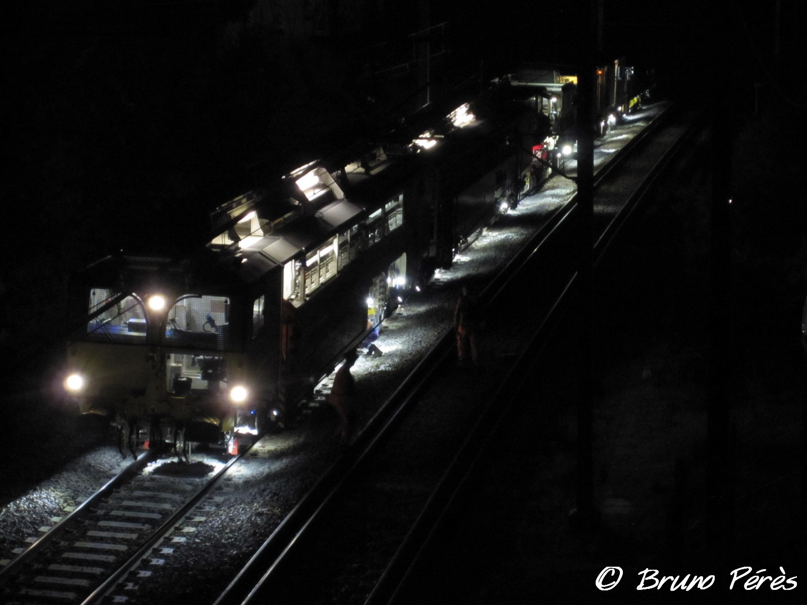 Cette bourreuse appartenant à Enorail travaillait cette nuit sur le RVB Portet-sur-Garonne - Boussens (31). Je n'ai malheureusement pas pu lire son immatriculation :spamafote: