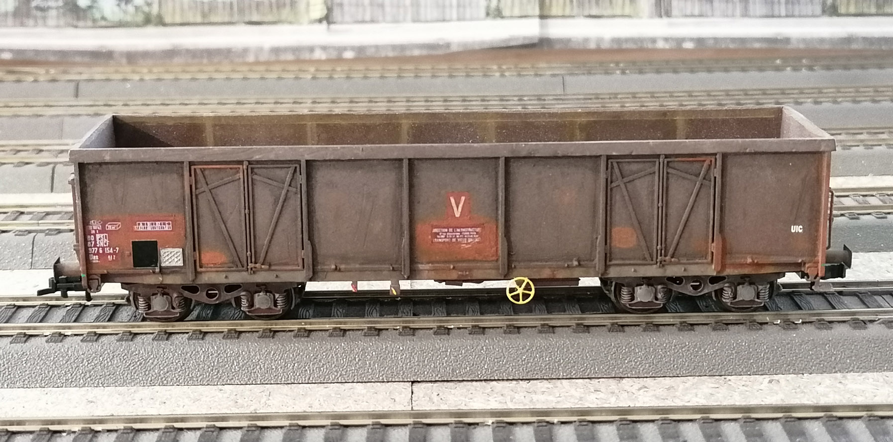 ce que j'ai remarqué c'est que les parois des modèles réels sont déformées par les chargements. Sur LR forum, Gonzo mettait de l'acétate pour produire cet effet. Je trouve que cela rends super en tout cas bien mieux que les parois bien lisses des wagons sortis de leur boite. De mon côté, je prends de la colle blanche que je tapote au pinceau pour être irrégulier. Avec un cure dent on peut donner aussi l'impression de traces faites par un godet de pelle mécanique. En même temps (avant que la colle prenne) après je rajoute le rust terxture pour qu'il soit collé lors du séchage. C'est un produit qui fait des effets grumeleux. On peut prendre aussi à mon avis des terres à décor. C'est du bidouillage, mais ça rends pas trop mal.
