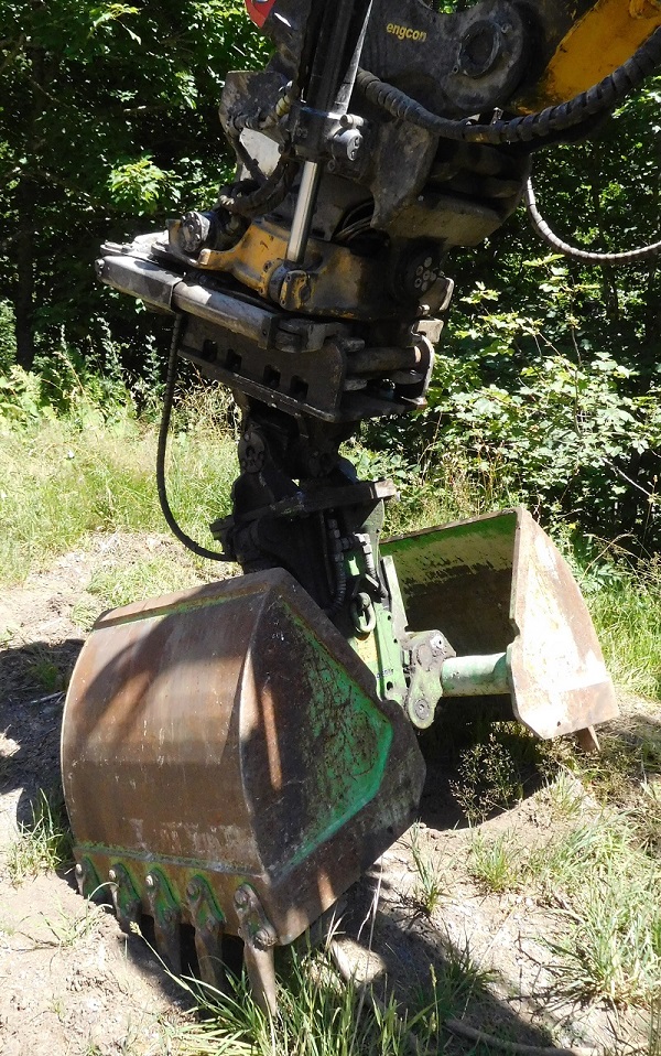 A noter sur cette machine, un montage assez particulier de la benne preneuse directement sur le Tilt-Rotator ENGCON :