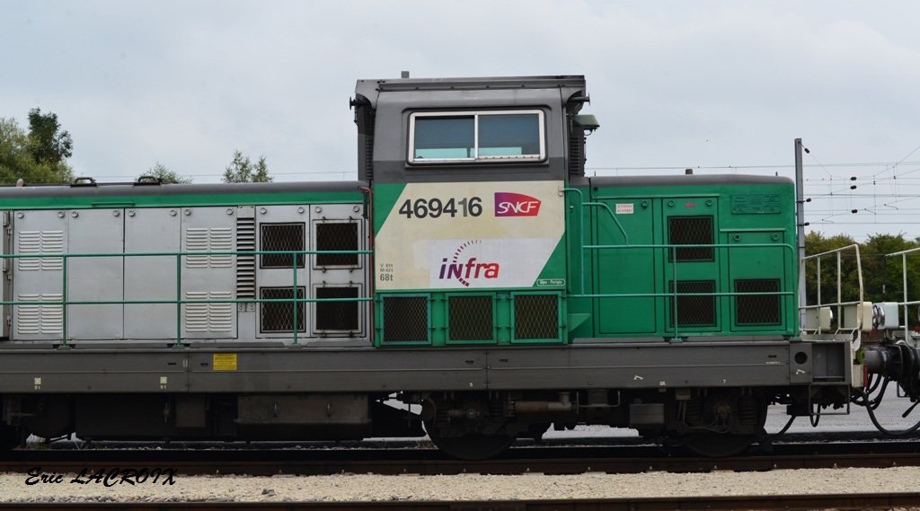 Voici la 469416 Infra avec le logo en livrée Fret (ex 66416 mise en service le 28-12-1968) avec le wagon graisseur de caténaire