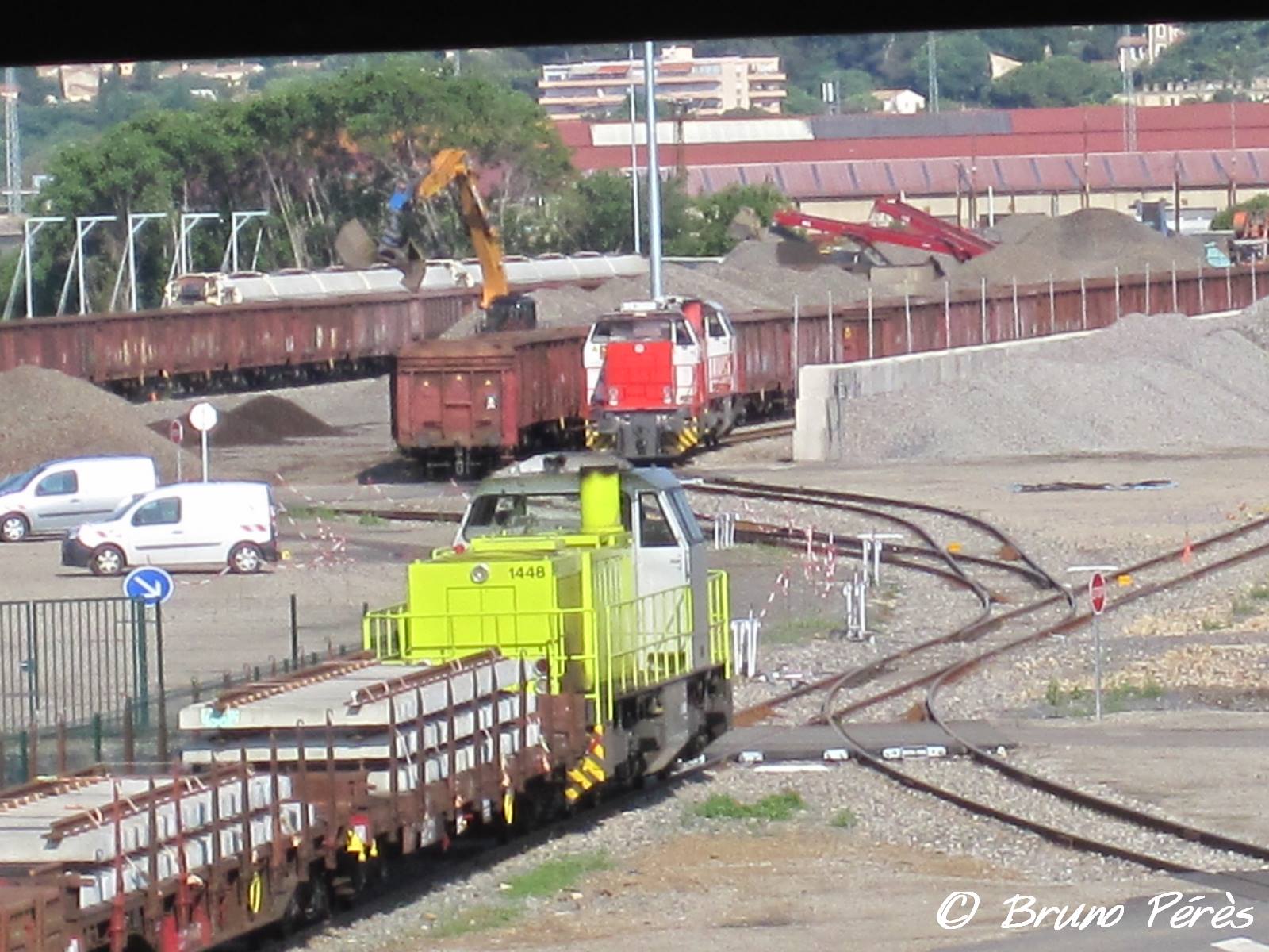 De retour d'une expo de modélisme à St Rambert d'Albon le 30/05/2023, je me suis arrêté à Nîmes Est où se trouve une base de travaux. Malheureusement, je n'ai pas eu la possibilité d'y entrer, ce qui est normal, mais j'ai pu faire quelques photos depuis un pont, avec les moyens du bord. Donc désolé pour la piètre qualité des photos, mais au moins, on peut voir l'organisation de cette base.