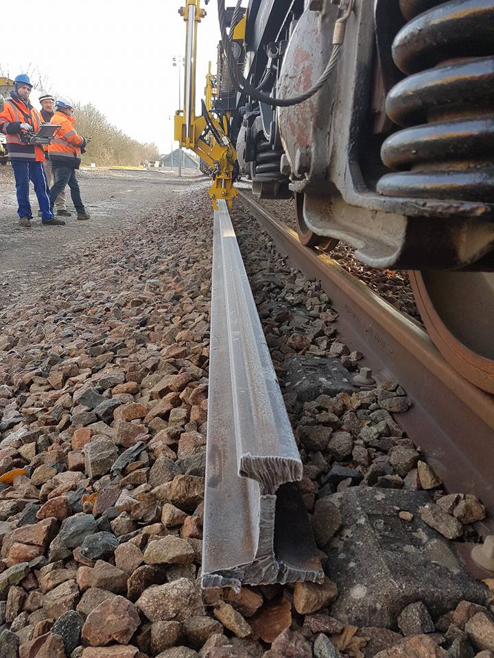 Voici un nouveau wagon de déchargement et de chargement de rails pour TSO en démonstration le 13 décembre 2017
