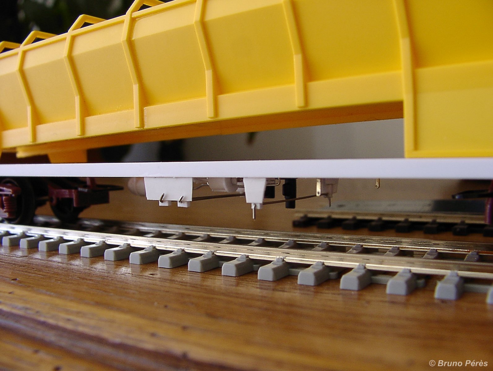 Su les photos, on voit les imperfections qui sont nombreuses, mais qui sont bien moins visibles en vrai ! De même on peut voir les traces du fraisage pour enlever les pièces précédemment collées en lieu et place de pivots de boggies Jouef.