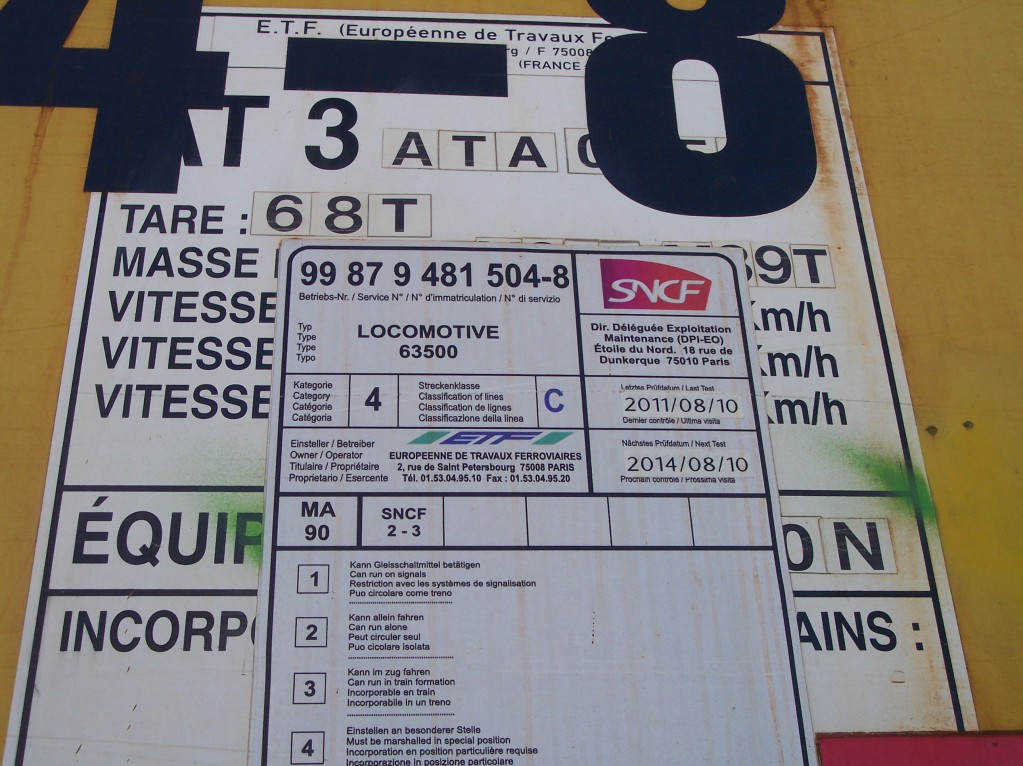 Bonjour, ce matin, j'ai photographiè sur la ligne Tassin - Brignais, un train de travaux, (dans le cadre du tram - train de l'ouest lyonnais) tracté par la BB d'ETF n° 504-8 . Mais comme le train passait certe au ralenti, j'ai pu relever au "pif" le n° UIC : 99 87 9 481 504-8 mais je n'en suis pas sur ??