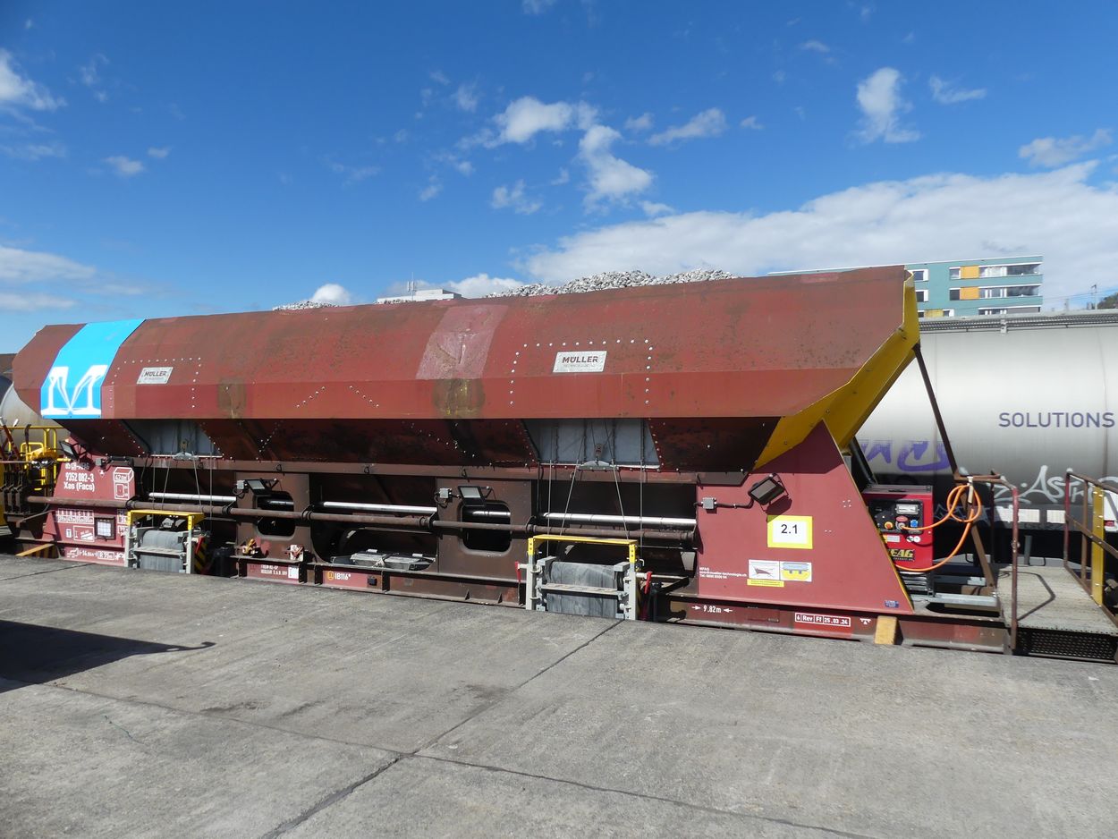 Voici un wagon particulier. Il s'agit d'un wagon de ballast de type Facs modifié. Il embarque des bandes transporteuses commandée par câble et télécommandées permettant de décharger sur le coté de la voie. pratique pour les chantiers de drainage.