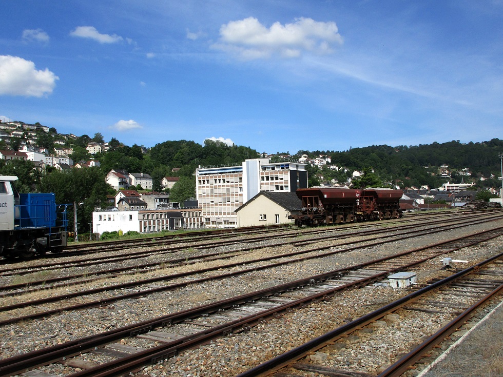 Retour en gare de Tulle hier mercredi 9 Juin 2021. Des indices visibles laissent penser à une activité de travaux en ligne : une G 10000 Vossloh Ferrotract, la rame de trémie de ballast vide et la rame de longs rails ont quitté le faisceau depuis la semaine dernière. La position de la bourreuse et des wagons trémie chargés de ballast sur les voies ainsi que la composition de cette rame diffère de leurs emplacements respectifs de la semaine passée.