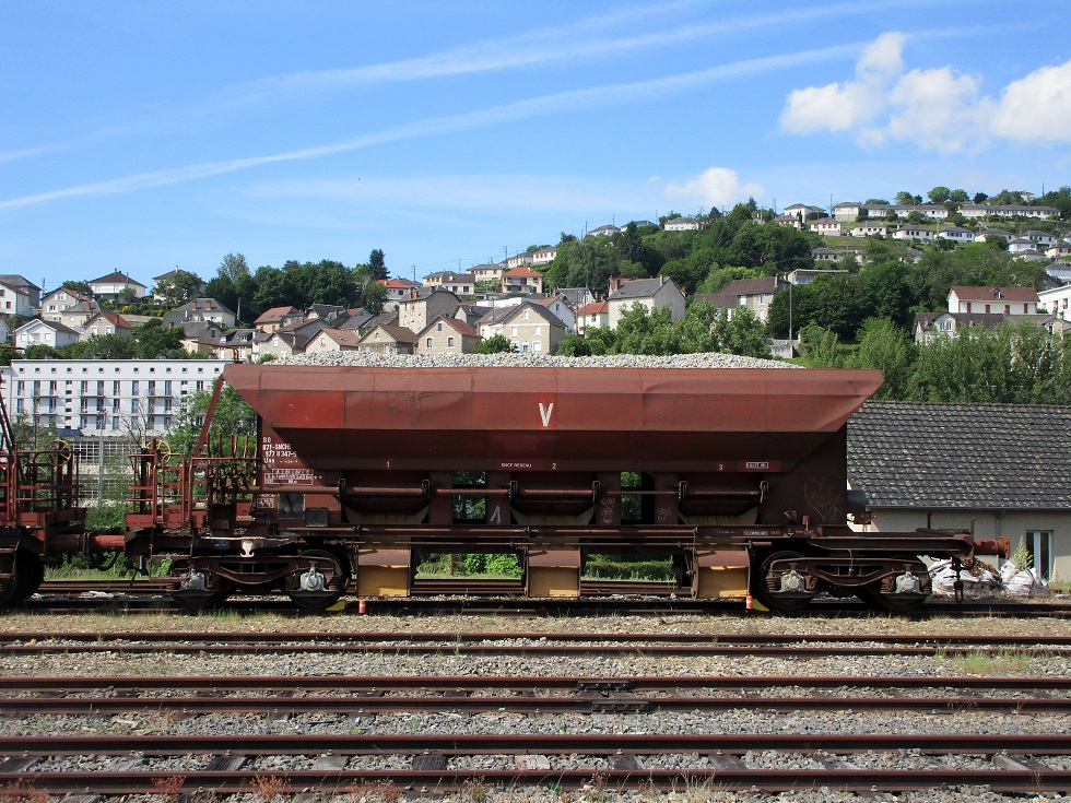 Alors qu'un peu plus loin sur la même voie au milieu de faisceau se trouvent 2 wagons trémie à bogies chargés de ballast :