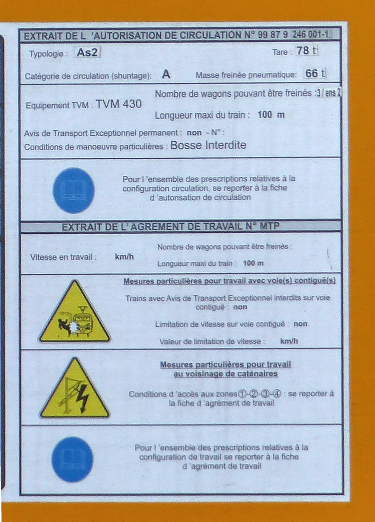 Agrément de travail MTP - 03-02-2016 / 03-02-2019 avec TVM 430 et Tare de 78T