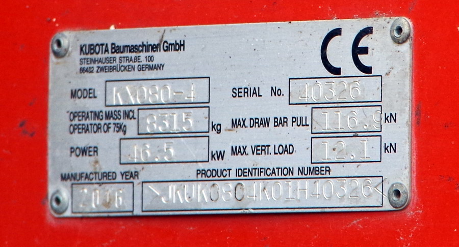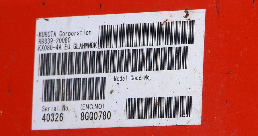 Kubota KX080-4A n° de série 40326 n°JKUK0804K01H40326 de 2016