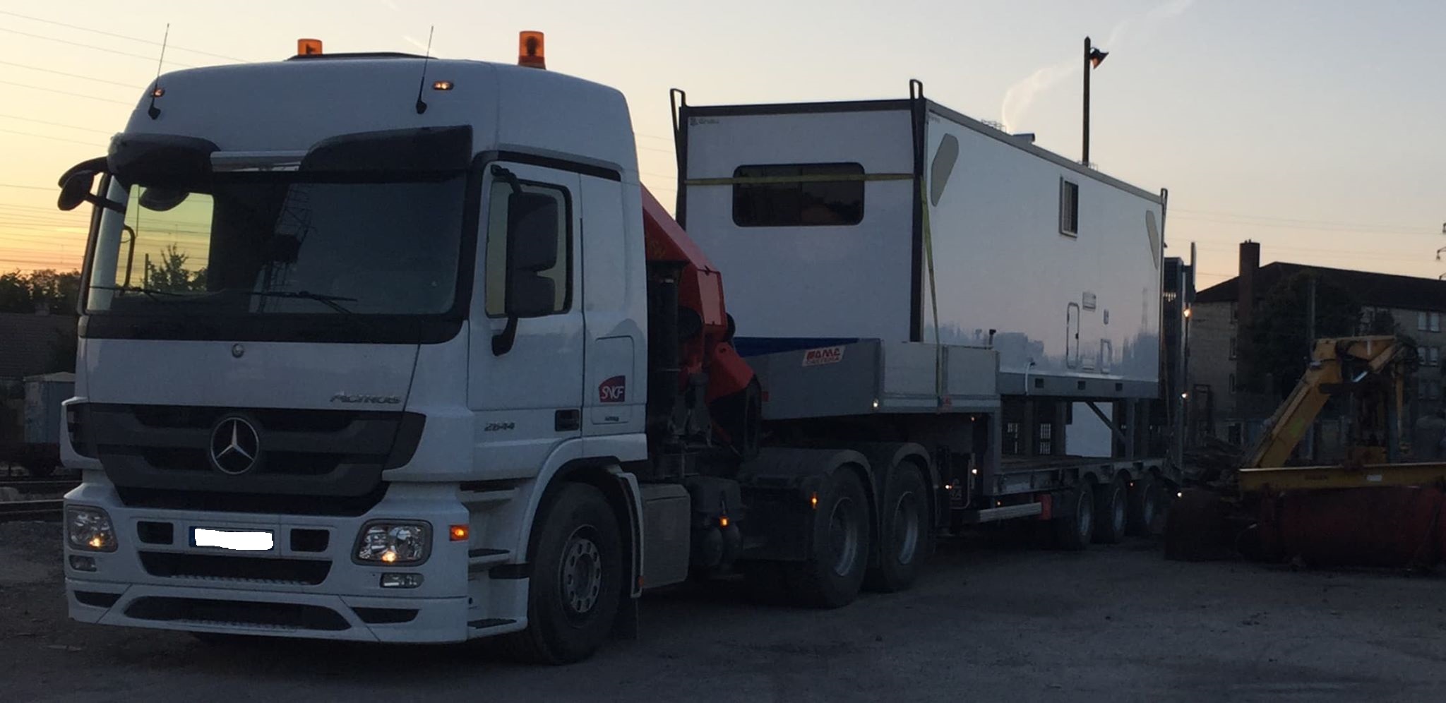 Remorque Kaiser porte engins routiers et ferroviaires CZ 908 FE Ã Mulhouse Wanne le 06/02/2021