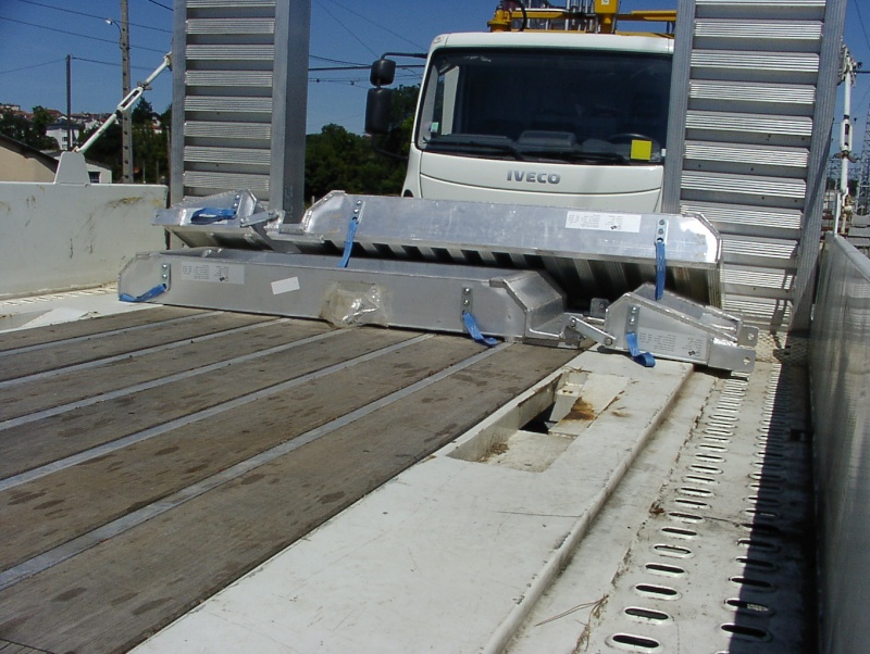 La MRT est placée sur le camion par sa grue Palfinger et la pelle monte sur la remorque. Ainsi, une équipe restreinte se déplace pour les petits renouvelement (ici en triage).