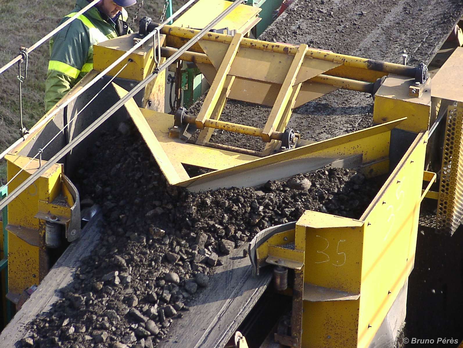 Ces bandes transbordeuses (est-ce le nom véritable ? J'ai déjà lu tapis ou encore convoyeurs ...) existent sous plusieurs types. Voici celles utilisées actuellement par l'entreprise ETF. Le soc peut avancer ou reculer, se lever ou se baisser alors que la bande peut basculer de droite ou de gauche, tout ça pour répartir au mieux le vieux ballast dans les différents wagons d'une part, et d'autre part dans chaque wagon. Mais des photos valant mieux qu'un long discours, en voici 4 prises entre novembre 2007 et février 2008 entre Toulouse et Montlaur.