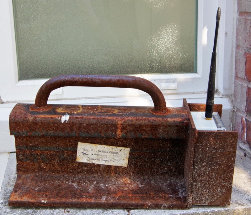 Le bout de rail peint en jaune et marqué Arras, appartient à ETF, il est creux et sert à y mettre un thermomètre destiné à connaitre la température