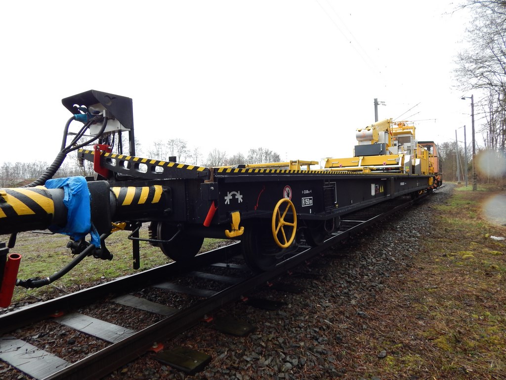 Conçu et monté dans les ateliers du constructeur Novium, le train de travaux dévolu à la pose et dépose des poteaux et poutres caténaires