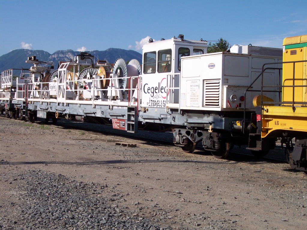 Le wagon dérouleur Cegelec 99 87 9 332 504-9 et le wagon plate forme 99 87 9 336 522-7 sur les voies de garage des rames INFRA/SNCF