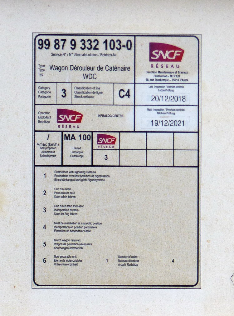 Voici le wagon Dérouleur de caténaire WDC 99 87 9 332 103-0 SNCF RESEAU Infralog Centre